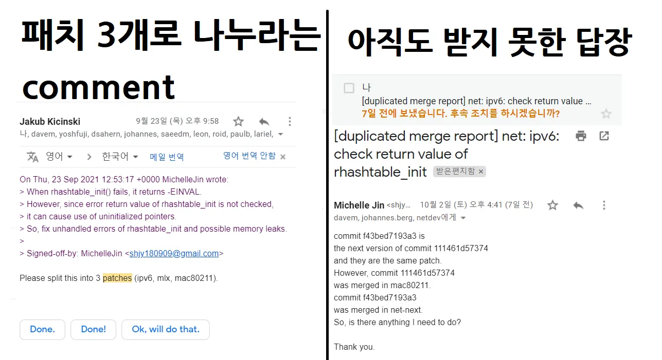 그런데 rhashtable_init이라는 함수가 ipv6, mac80211, mlx5에 모두 쓰이다보니 patch를 3개로 split하라는 comment가 왔습니다.... (patch를 split하려면 각각 commit 메시지를 적어주고 coverletter까지 쓰고, 메일이 patch 갯수만큼 보내짐 + 하나를 다시 빠꾸먹으면 모든 패치를 다시 다 보내야함)겨우겨우 patch를 split해서 보냈는데, 또 코드 cleanup comment가 있어서 다시 v3 패치 3개(+coverletter)를 보냈습니다.
