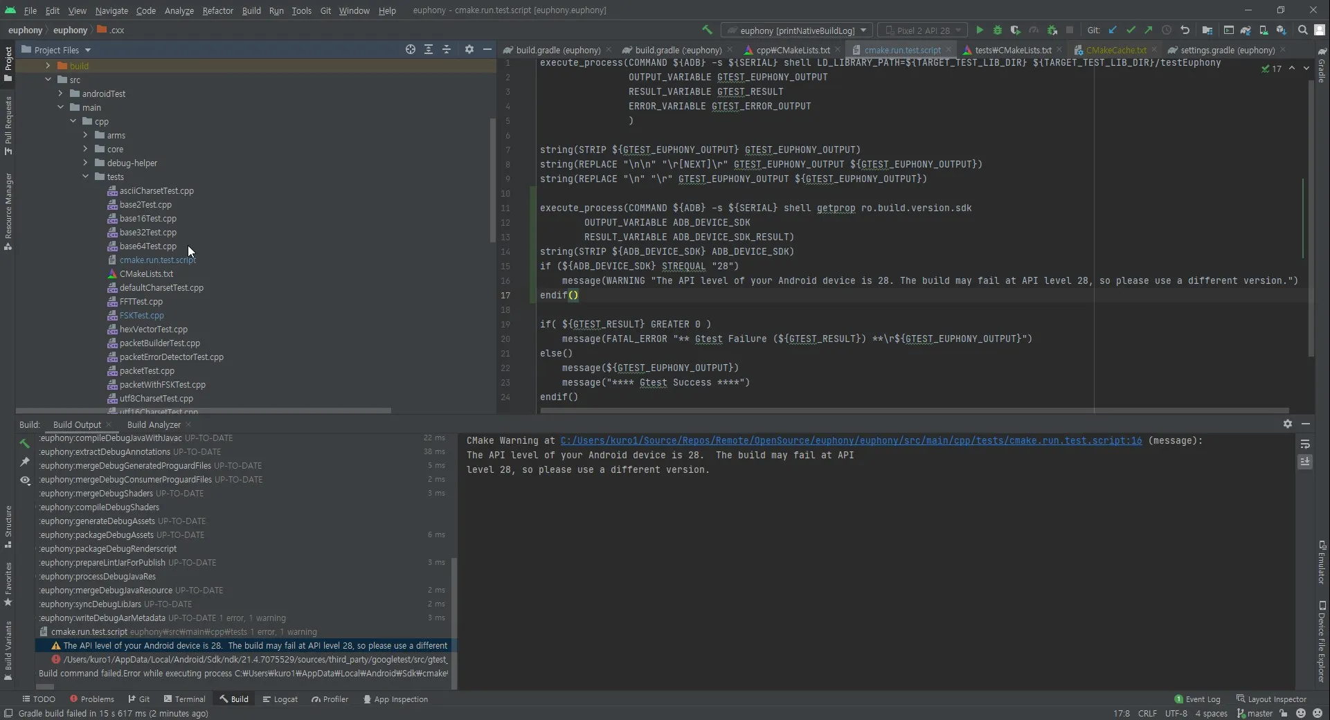 문제 재현에 성공한 멘토님의 기기와 실패한 멘토님의 기기의 Android API 수준이 달랐던 겁니다. 그래서 API 버전을 의심하기 시작했고 이를 바꿔가며 테스트하기 시작했습니다. 그렇게 1시까지 열심히 테스트하였습니다. 하지만 테스트 결과 같은 API 버전인데 성공할 때도 있고 실패할 때도 있었습니다. 그렇게 또다시 테스트를 반복하였고... 결국, 새벽 2시에 정확한 조건을 알아냈습니다. 바로 API 28에서 gtest의 test case 수가 227개 이상일 때 기기에서 segmentation fault가 발생해서 build에 실패하던 것이었습니다. 아뿌