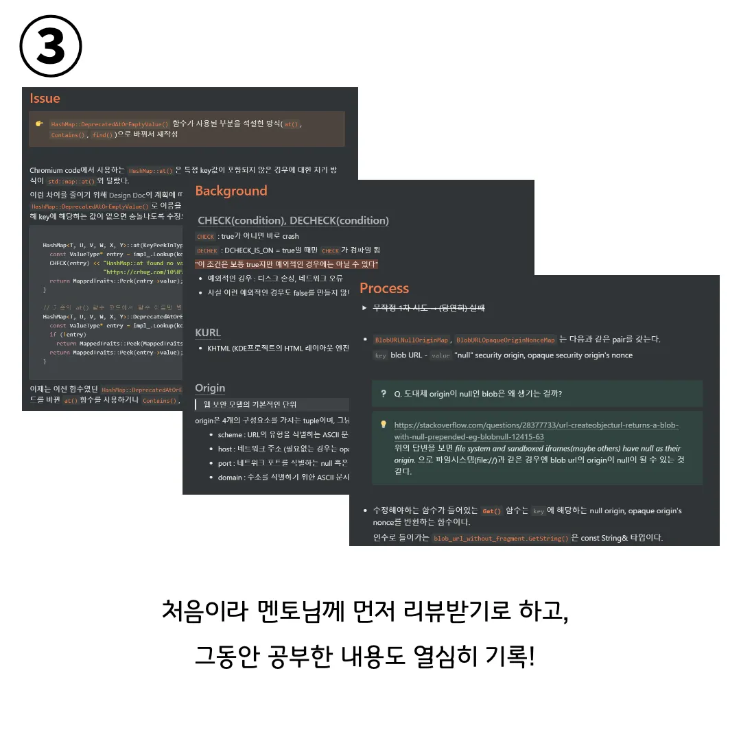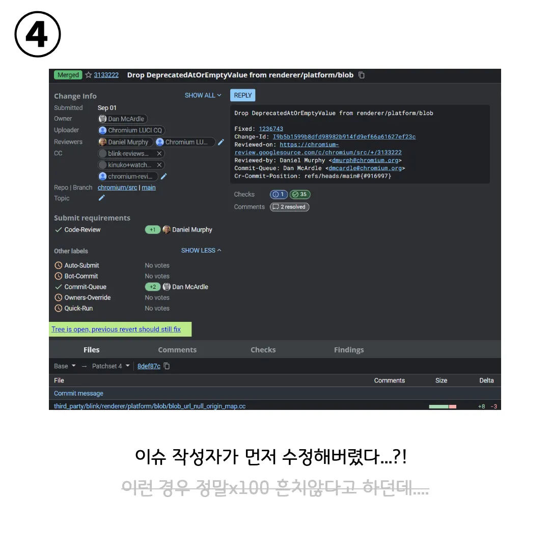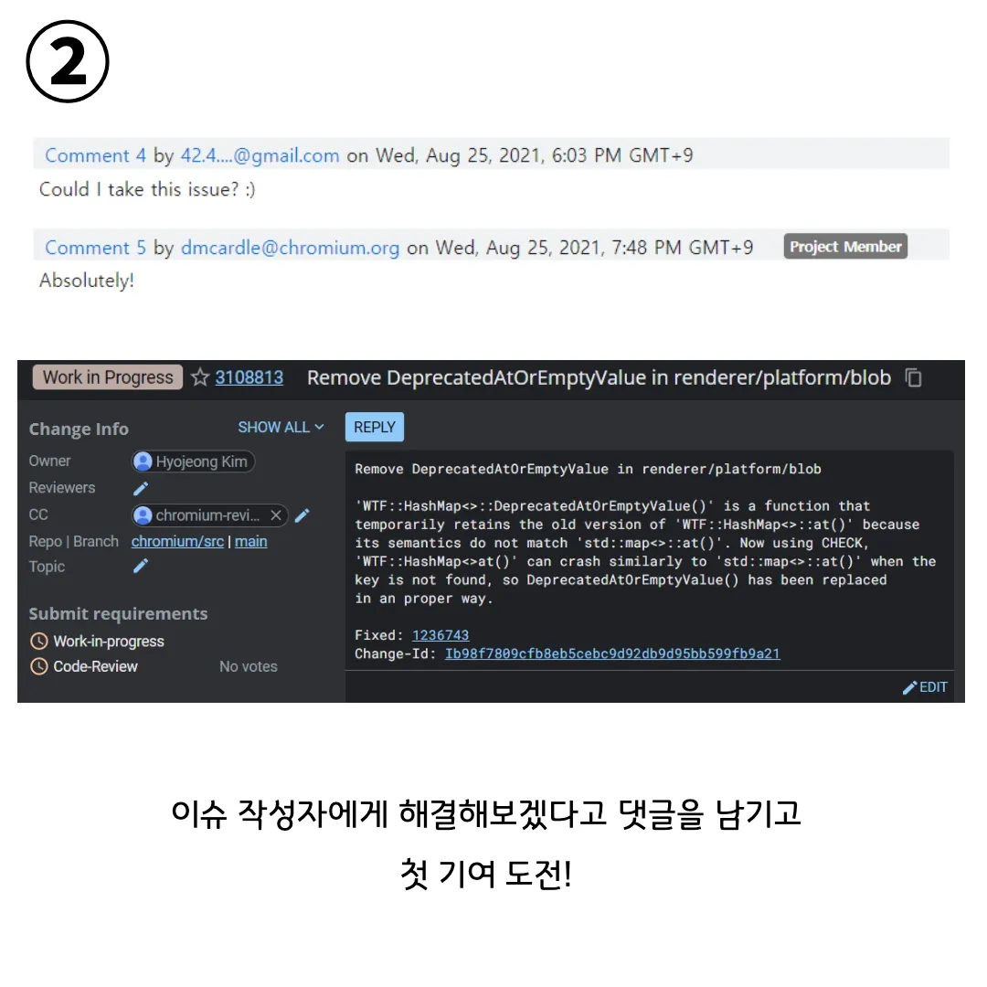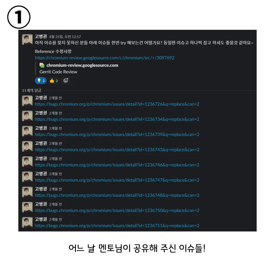 Chromium / Blink 자체는 상당히 어려운 프로젝트였기에, 오픈소스 입문자인 저는 그 속에서 해볼 수 있는 적당한 난이도의 이슈를 찾는 일은 정말 쉽지 않았습니다. 열심히 골라봤던 첫 이슈는 공부하려고 보니 윈도우 환경에서는 테스트할 수 없는 상황이었고, 일주일이 넘도록 이슈를 결정하지 못하던 시기에 멘토님이 구세주처럼 나타나 이슈들을 공유해주셨습니다.