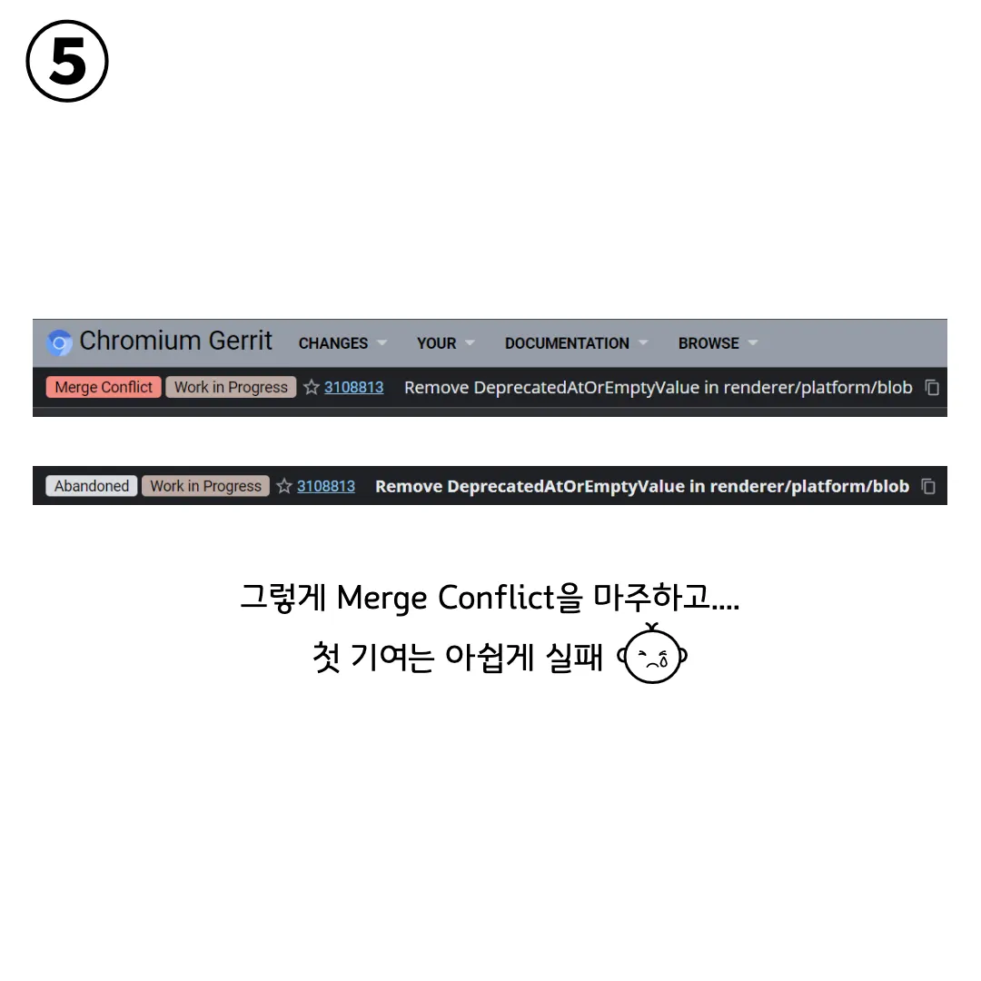 멘토님은 본인이 좀 더 빨리 리뷰했으면 Merge까지 갈 수 있었을 텐데라고 하시면서 매우 미안해하셨습니다. 하지만 제가 속도가 느린게 더 치명적이었을 겁니다. 결국 희망차게 시작했던 처의 첫 패치는 merge conflict과 함께 실패로 돌아갔습니다.