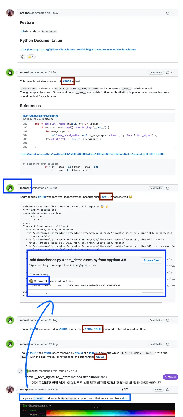 처음 발대식날부터 dataclasses 고치겠다고 말씀드리고, 끝나지 않는 버그의 덩굴을 타고 들어가면서 한달 내내 필요한 버그를 모두 고쳤습니다. 그런데 이제 준비가 끝났으니 dataclasses를 고쳐야지! 하고 들어가봤더니 이미 누가 해버렸다는거에요. 범인은 바로 멀리 있지 않은 같은 팀 지홍님이었습니다. 한달동안 씨름하면서 보스 다 잡아놨더니 막타만 치고 가는 지홍님 나빠요. https://github.com/RustPython/RustPython/issues/2623