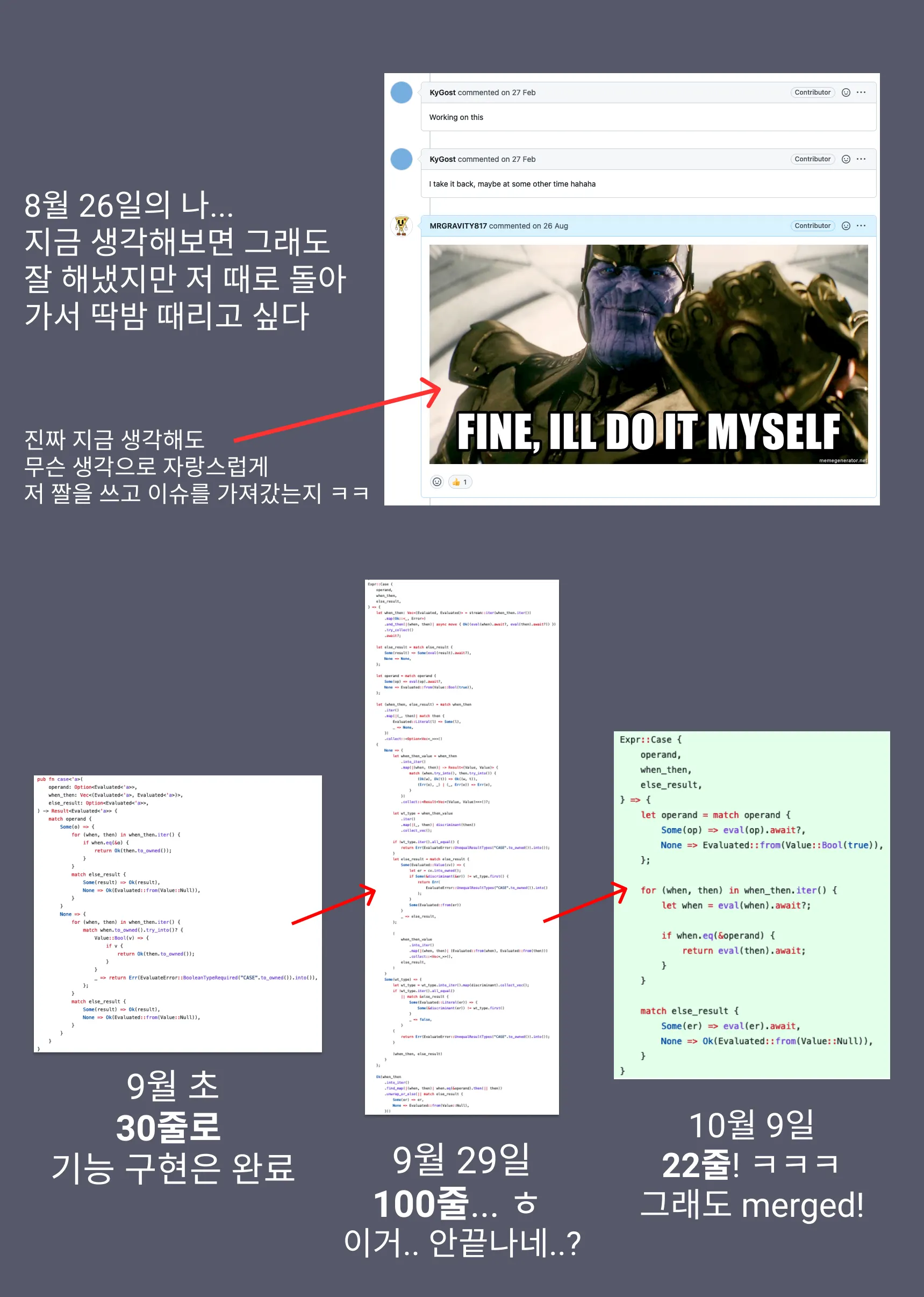 때는 8월 26일, Challenges 프로그램이 끝나갈 무렵이었습니다. 데브옵스 관련 PR을 끝내고 다음 이슈를 찾던 중, 멘토님께서 저에게 SQL의 CASE 구문을 구현하는 이슈를 주셨습니다. 당시 원래 진행하던 분이 계셨는데 잠시 중단한 상태였습니다. 나름 여러가지 PR을 1달동안 진행해본 터라 자신감 넘치는 타노스 짤을 쓰면서 그 이슈를 Get 해버렸습니다... 앞으로의 고단한 여정은 예상도 못한 채 말이죠. 9월 초 쯤에 간단한 문법들을 사용하여 기능 구현은 완료 했습니다. 그 때 당시에는 CASE 구문의 디테일을 잘 몰랐던 터라 간단한 테스트들은 통과했지만 결과값의 자료형 일치, 구문마다 evaluate 여부를 따지는 로직... 등등 더 신경 쓸게 많다는 것을 멘토님의 리뷰를 통해 알고 차차 코드를 고쳐나갔습니다. 또한 GlueSQL에서 아주아주 중요히 여기는 “no unwrap()”, “no clone()”, “no mutable” 의 엄격한 철칙들을 지키면서 코드를 고쳐나가다 보니 9월 말 즈음 정확히 기능은 같지만 코드는 크고 아름다운(?) 100줄 정도가 되어 있었습니다. 그 100 줄의 코드 속에는 Rust 언어의 다양한 함수형 프로그래밍 기법들, 소유권 개념을 잘 활용하여 deep copy 없이 쓰여진 구문들 등... 지금 다시보다 너무 감격스러운 코드였습니다. 그렇게 몇가지만 더 고치면 끝나가려던 찰나, Maintainer 이신 멘토님께서는 GlueSQL의 확장성을 위해 과감하게 다양한 API에서 Row 마다의 자료형 체크를 하지 않기로 결정하셨습니다. 그 말인 즉슨, 저에게는 다시 9월 초에 작성했던 코드(보다 심지어 덜 엄격하게)로 돌아가면 된다는 말이였습니다. 그렇게 기준을 맞춰서 다시 코드를 짜보니... 100줄이었던 것이 22줄이 되었습니다! 아까 제가 자랑했던 그 Rust의 다양한 아름다움을 보여주던 코드는 아쉽게도 다소 컴팩트하고 노멀하게 바뀌었죠. 이렇게 결국 Merge가 되기까지 약 1달 반이 걸렸습니다 ㅎㅎ